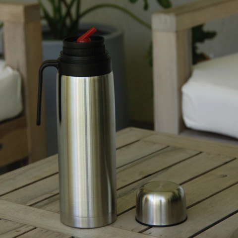 El Termo Media Manija ® representa comodidad. Está fabricado en acero inoxidable y posee pico cebador color rojo.